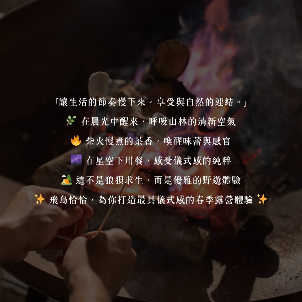 你可以是爸媽、是戀人、是朋友,也可以只是你自己——不用安排太多行程、不用一直說話,讓山林帶著你,自然地走過每一刻。飛鳥恰恰從來不想成為「最熱鬧」的營地,而是希望成為你記憶中最安靜、最放鬆、最舒服的那一片森林角落。