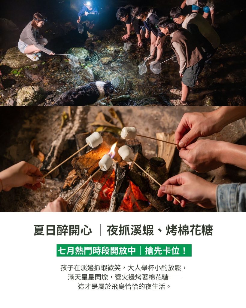 全台難得的夜捉溪蝦體驗,適合大人小孩一起尖叫、一起驚喜;之後在星空下看電影,銀幕、啤酒、棉花糖全部到齊。這不只是一場電影,而是和自然、火光、笑聲一起編織的夜晚。